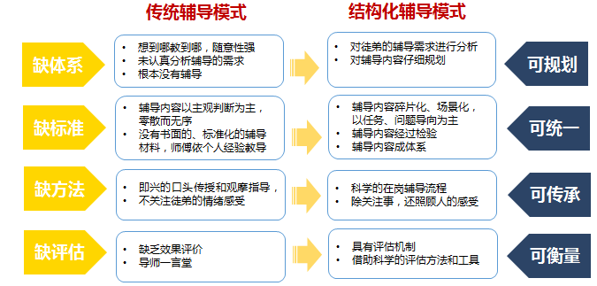 與傳統(tǒng)的“師帶徒”模式和導(dǎo)師制相比,結(jié)構(gòu)化在崗輔導(dǎo)具體以下優(yōu)勢(shì): |