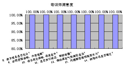 從培訓(xùn)評估結(jié)果來看,百年基業(yè)的這次培訓(xùn)效果非常好,本次培訓(xùn)項(xiàng)目課程滿意度和培訓(xùn)師滿意度都高達(dá)100%。這與學(xué)員的積極配合、安陽移動(dòng)人力資源部的辛苦工作是分不開的。