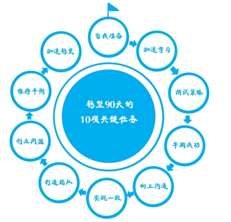 本案例中采用的轉型圓桌會是行動學習和知識內(nèi)容的完美融合。其知識內(nèi)容部分以邁克爾·沃爾金斯的“轉型 90 天”理論為基礎,該理論總結了一個崗位角色轉型的成功路徑。