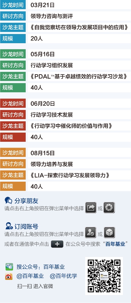 2014年百年基業(yè)繼續(xù)系推出培訓(xùn)經(jīng)理人沙龍。主題涵蓋領(lǐng)導(dǎo)力與行動學(xué)習(xí),內(nèi)容實(shí)用,師資一流,教學(xué)方法創(chuàng)新!歡迎大家提前報名預(yù)留名額。每公司可免費(fèi)一人參加喲!